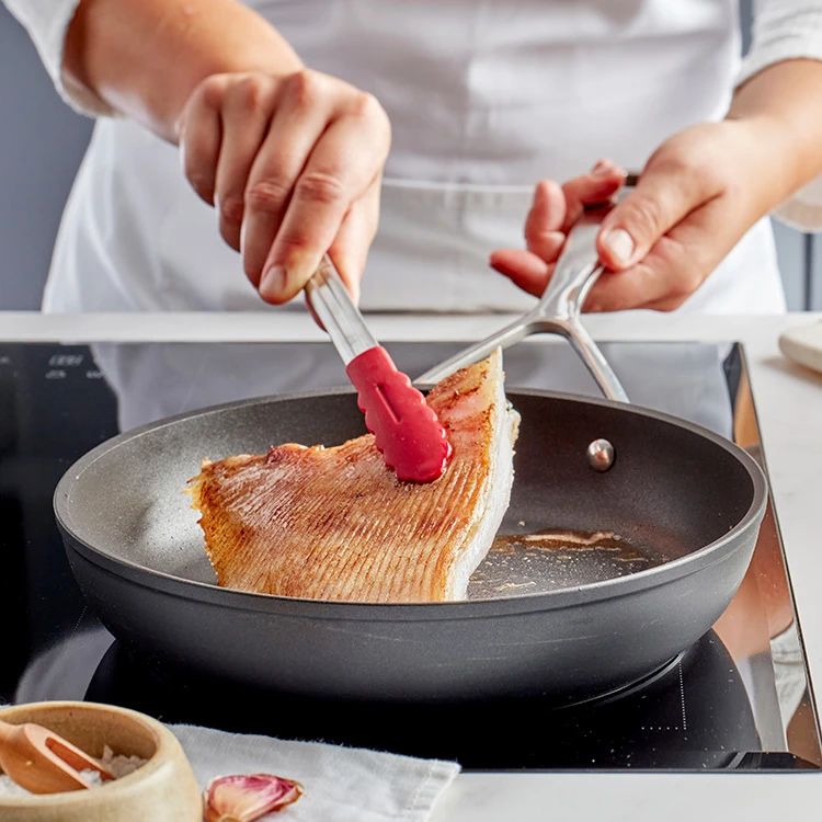 In deze Koekenpannenset bak je zorgeloos en met succes alle mogelijke delicate ingrediënten: vis, zeevruchten, eieren, zwezeriken, courgettebloemen, gepaneerde producten … Zolang je dat maar met behulp van accessoires in silicone of hout doet, om beschadiging te voorkomen.