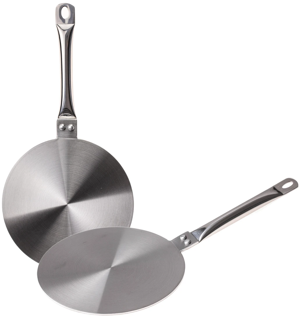 Deze inductie adapter is gemaakt van roestvrij staal en heeft een diameter van 14 centimeter.