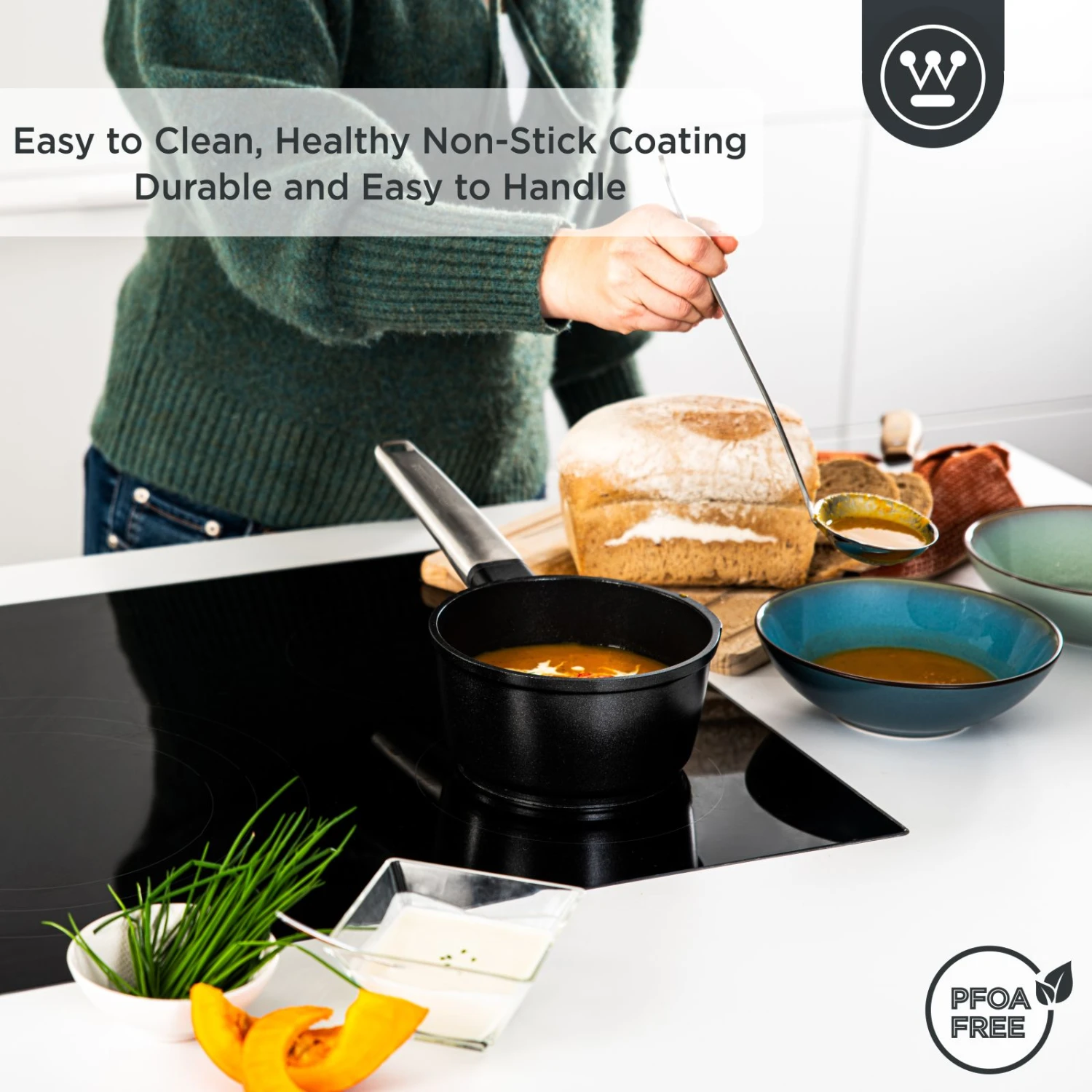 Koken en bakken moet niet alleen leuk en smakelijk zijn, het moet ook veilig gebeuren. De pannen van Westinghouse zijn van hoogwaardige kwaliteit. Deze pannen van de Westinghouse Performance collectie zijn lichtgewicht, hebben een uitstekende warmtegeleiding, bevatten een antiaanbaklaag die PFOA- en PTFE-vrij is en zijn makkelijk schoon te maken in de vaatwasser.